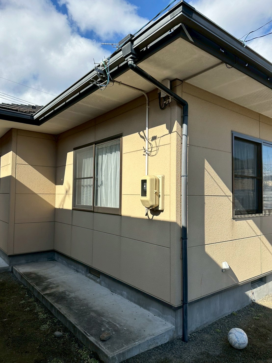 | 塗料(色) | 屋根:シリコン塗料・ファインルーフsi (ブラック)、下塗りはファインパーフェクトベスト強化シーラー 外壁:シリコン塗料・インディフレッシュセラ(IF9307)、下塗りは水性カチオンシーラー 破風板:シリコン塗料・ファインルーフsi(ブラック) 雨樋:シリコン塗料・ファインルーフsi(ブラック) 軒天:ケンエースG-II(N-90) 基礎:キソエース(N-75) |