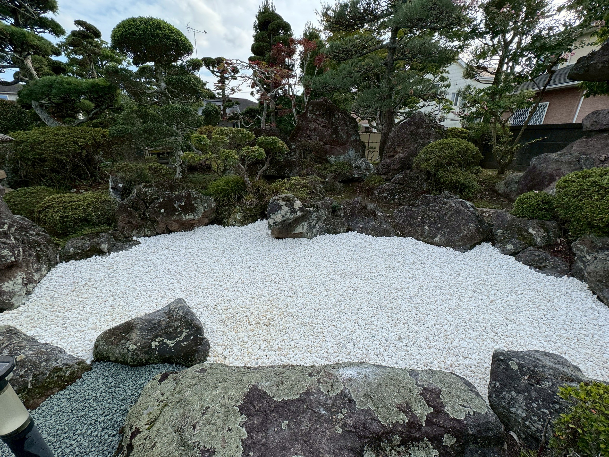 多賀城市高橋のS様邸において、庭の改修工事を行いました。草取りを大幅に軽減するために、防草シートを張った後、青砂利を敷き詰めました。また、池があったところは白い玉砂利にし、庭にアクセントを加えました。